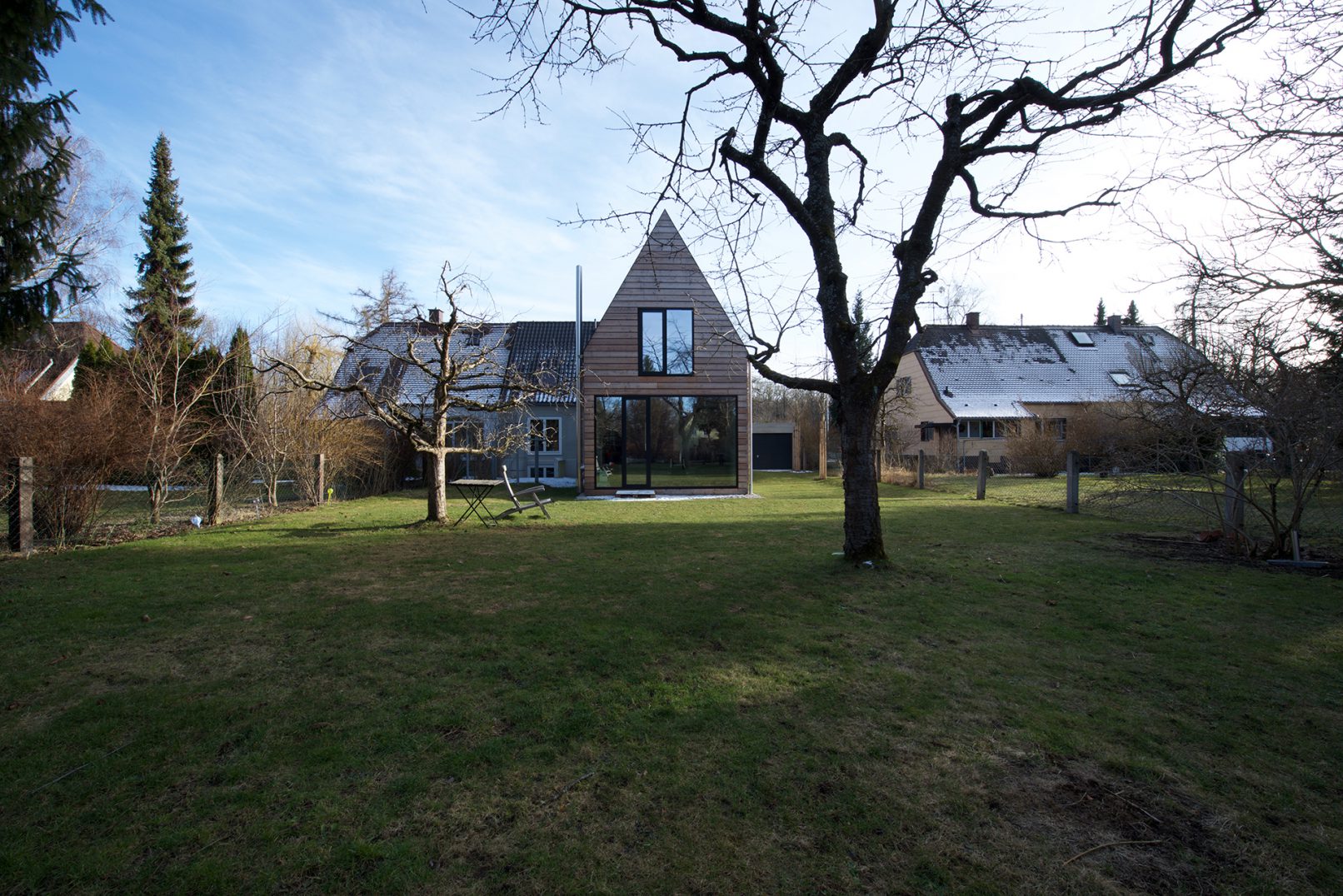 Im ehemaligen „Fasanengarten“ des Nymphenburger Schlosses wurde in den 1920ger Jahren eine Gartenstadt errichtet. Die Grundstücke sind groß, die Bestandshäuser winzig. Das Baurecht ist extrem eingeschränkt. Das Konzept für die Erweiterung eines Siedlerdoppelhauses für eine große Familie teilt das Bauprogramm in ein Eltern- und ein Kinderhaus. Der neue Anbau wird von den Eltern genutzt, der behutsam sanierte Altbau ist das Refugium für die drei Kinder. Der Neubau ist modern gestaltet, ohne den Altbau zu bedrängen. Durch das extrem steile Dach des neuen Hauses wird baurechtlich ein Vollgeschoss „gespart“ und die Erweiterung in dieser Größe überhaupt erst möglich. Die Decke der neuen Holzkonstruktion spannt in Längsrichtung und ist an den Querwänden des Obergeschosses aufgehängt. Die Aussteifung erfolgt in beiden Richtungen ausschließlich über eine auf den Keller gestellte Ortbetonwand. So kann der Raum vom Eingang Altbau über den zentralen Essplatz und den abgesenkten Wohnbereich bis in den großen Garten „fließen“.